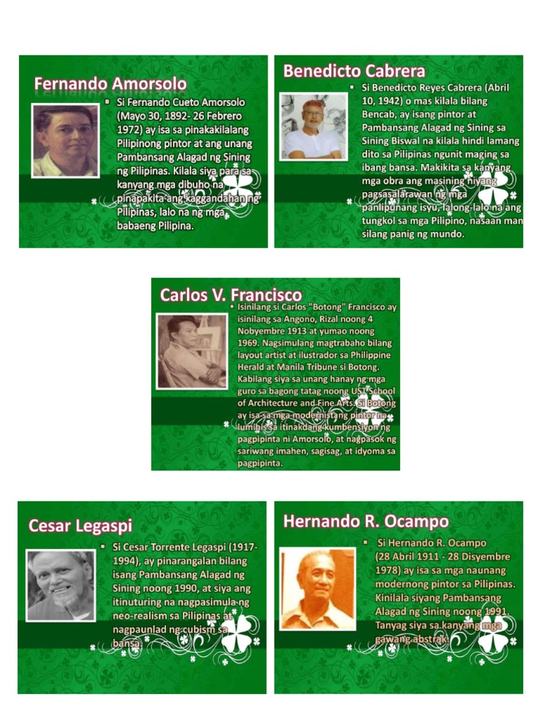 5 tanyag na pintor sa pilipinas. 122016 Benedicto Cabrera Mas kilala bilang Bencab ay isang pintor at Pamabansang Alagad ng sining sa Sining Biswal na kilala hindi lamang ditto sa Pilipinas ngunit pati sa ibang bansa. Arriola Propesor sa Filipino VICENTE MANANSALA 19101981. Anu-ano ang ipinapakita ng bawat obra ng pagpipinta ng mga tanyag na pator sabansa3.