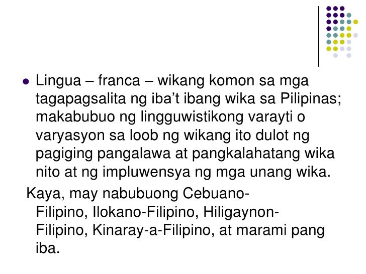 Ang Filipino Bilang Wikang Pambansa. 23072020 Bilang lingua franca ito yung wikang inaasahang nauunawaan at kayang salitain ng lahat ng tao saanmang pulo ng Pilipinas siya naninirahan. 11032020 Halimbawa bernakular ang Ingles sa Reyno Unido ngunit ginagamit bilang lingua franca sa Pilipinas katabi ng Filipino.